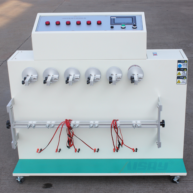 本機是將試料固定在夾具上,并加一定荷重,試驗時左右擺動,經(jīng)一定數(shù)次后,檢測其斷線率,查看其總擺動次數(shù),能自動計數(shù),試料彎折至斷線無法通電時,并能自動停止操作。本機符合UL817等有關標準“軟線組件和電源軟線通用安全要求”的規(guī)定及《頭戴耳機通用技術標準GB/T14471-93》線材彎折測試。