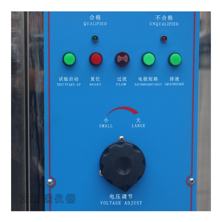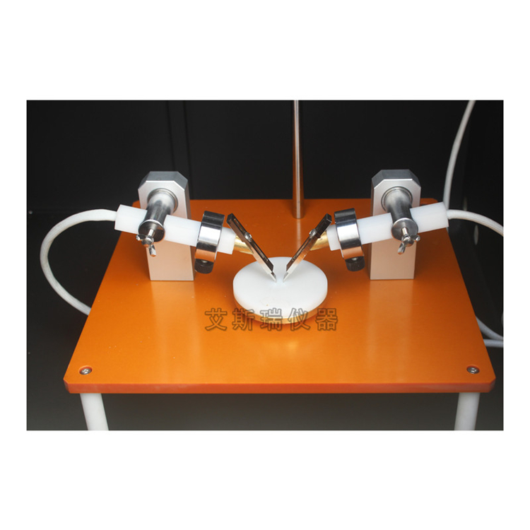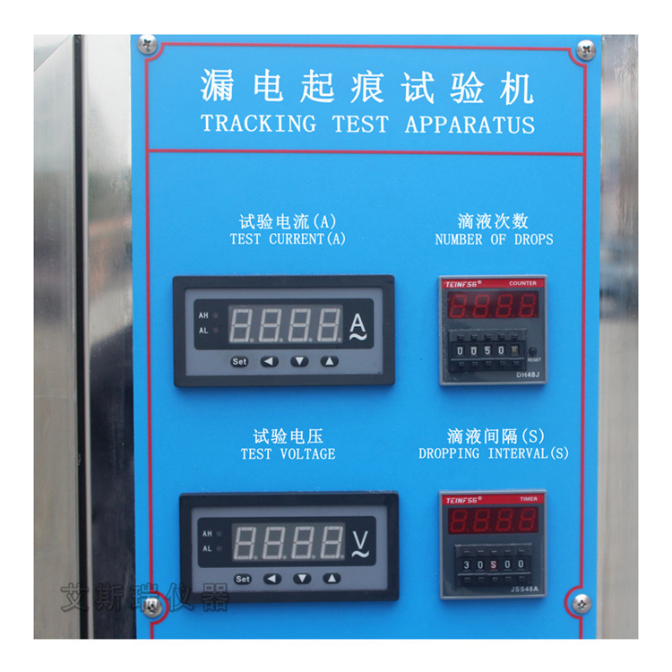 漏電起痕試驗儀采用矩形鉑電極,兩極對試樣的作用力分別為1.0N±0.05N。施加電壓在100~600V(48~60Hz)之間可調,短路電流在1.0±0.1A時,電壓下降應不超過10%,當試驗回路中,短路漏電電流等于或大于0.5A時,時間維持2秒鐘,繼電器動作,切斷電流,指示試件不合格。滴液裝置時間常數可調,準確控制滴液量大小44~50滴/cm3和滴液時間間隔30±5秒。