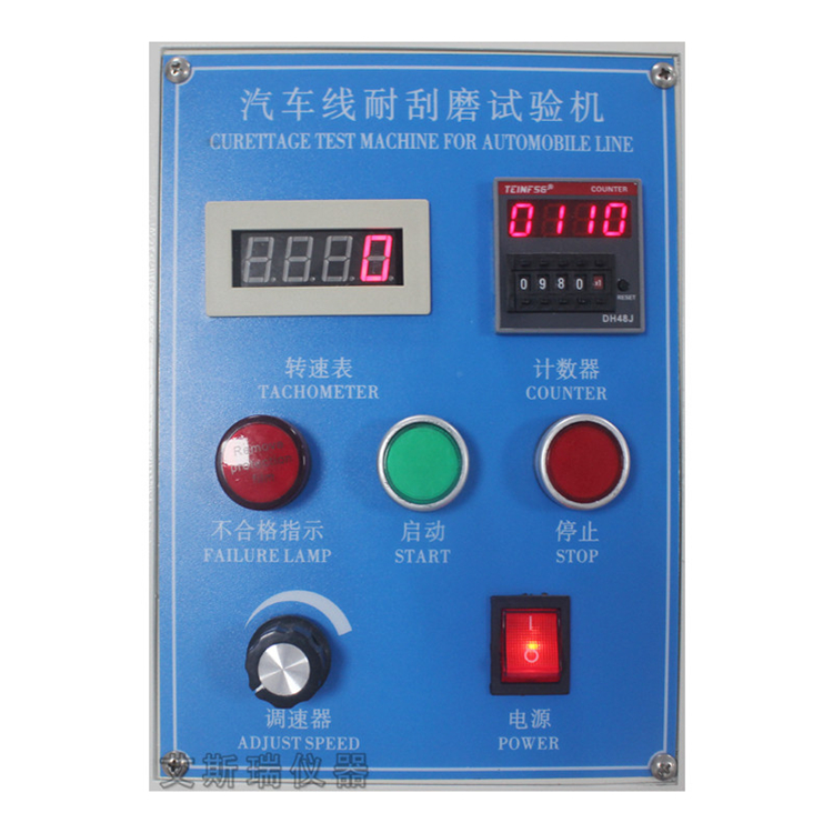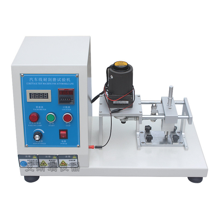 汽車線耐刮磨試驗機是刮磨汽車電線絕緣表面的裝置。本機沿試樣軸向往復刮磨絕緣表面,當刮針磨透絕緣接觸導體時自動停止。