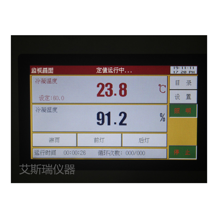 6、水槽溫度采用彩色觸摸屏程序韓國溫控儀控制加熱,水槽位于箱體下部,內置電加熱水器。在測試過程中,有一個測試段是黑暗凝露過程,它需要箱體內能產生較高溫度的飽和水蒸氣,當水蒸氣遇到相對較冷的樣板表面時,會在樣板表面凝結露水。