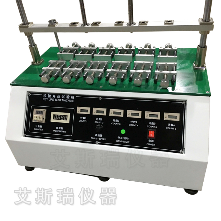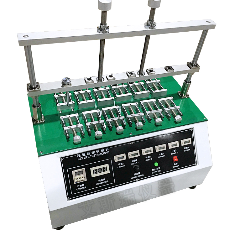 按鍵壽命試驗機適用于手機、電腦、電子詞典、藍牙耳機、車載播放器、搖控器按鍵、車輛防盜器、傳真機按鍵、MP5、MP4、MP3、按鍵開關、輕觸開關、薄膜按鍵、橡膠按鍵、硅膠按鍵等各類按鍵進行壽命試驗。本機是將產品分別置于對應工位的試驗位置上,按鍵測試桿在一定的試驗荷重、速度、行程、次數下模擬人對產品的使用壽命測試。
