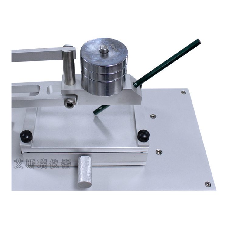 鉛筆硬度計測試說明:以硬度鉛筆刮搔涂膜表面測試涂膜層之表面硬度,硬度鉛筆以45°角固定,使前端筆心與涂膜層表面接觸,并加以適當荷重,依一定速度(JIS規范0.5mm/秒)移動試驗平臺使涂膜層表面移動經過筆心,涂膜層不會造成損害(刮痕)之軟鉛筆等級即可視為涂膜層硬度。
