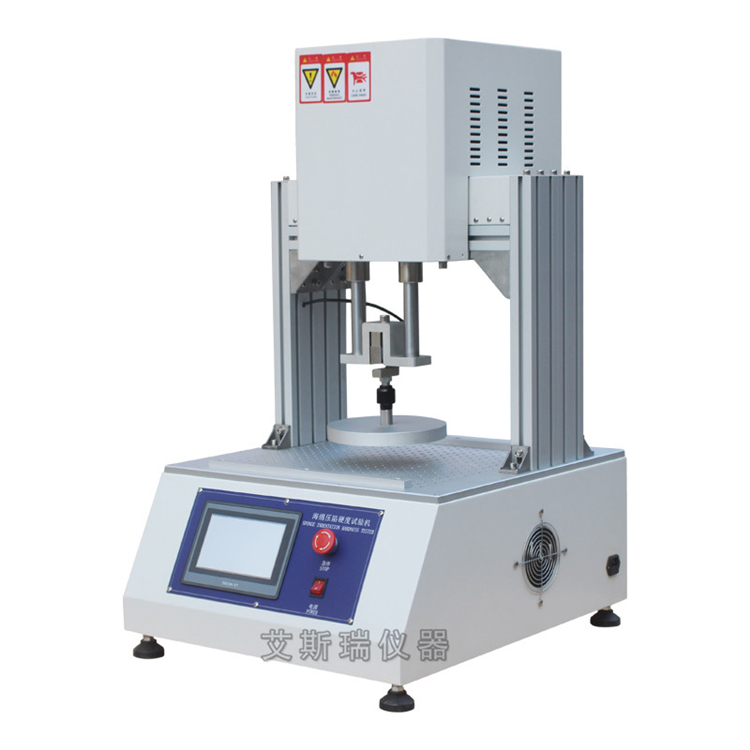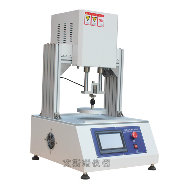 海綿泡沬壓縮應(yīng)力試驗(yàn)將試樣置于上、下壓盤間,上壓盤以規(guī)定速度向下壓縮一定尺寸的試樣至國(guó)家標(biāo)準(zhǔn)要求的A法(B法、C法)所規(guī)定的凹度時(shí),其上的荷重元將感應(yīng)到的壓力反饋給控制器處理并顯示,從而測(cè)得海綿、泡沫等試樣等材料的壓陷硬度。