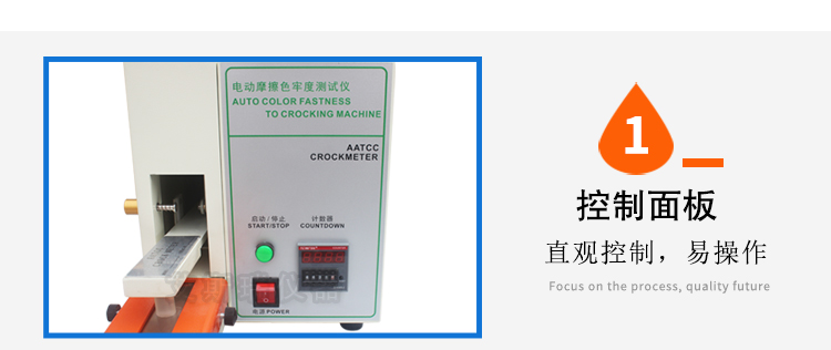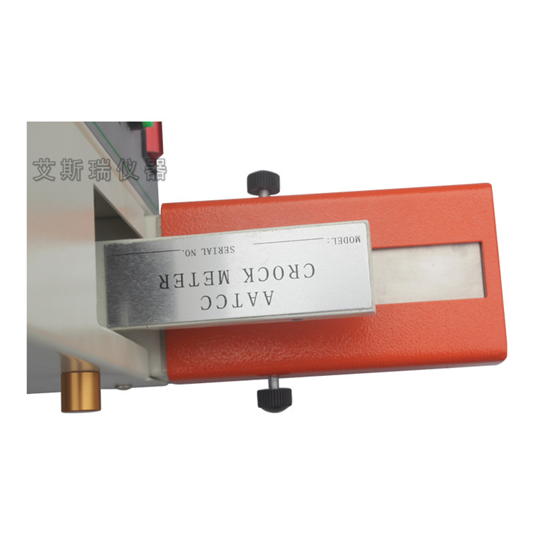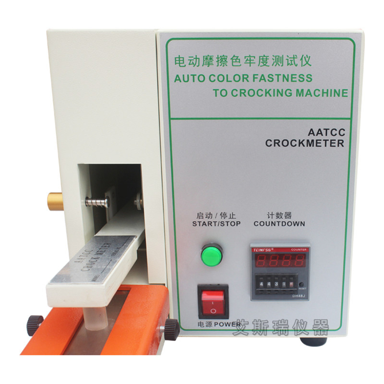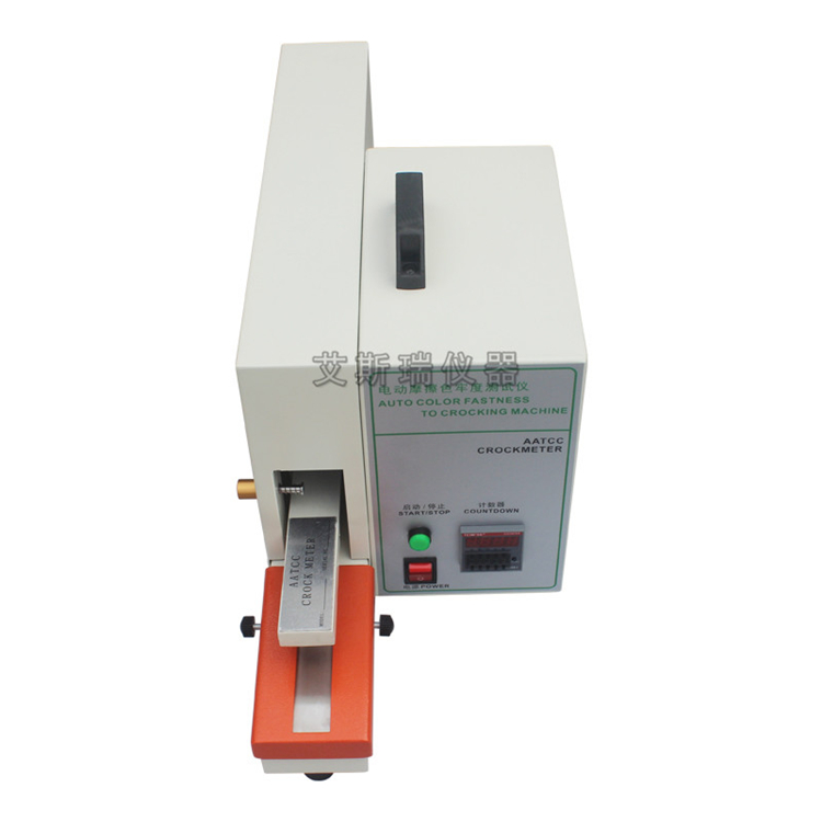 本儀器為整體式設計,主要由底座、摩擦傳動機構和計數器組成,用試樣夾將試樣和砂紙固定在底座的一側,搖動手柄使裝有白棉布的摩擦頭在試樣上作規定行程的往復運動,使白棉布和試樣相互摩擦,摩擦十次后觀察并用灰卡對比評定白棉布上的粘色程度,對織物試樣的染色或表面涂層的穩定性作出評判,為材料的評估和選擇提供參考數據。本儀器適用于紗線、色織、印染等紡織品以及玩具產品上或其內部的所有織物。
